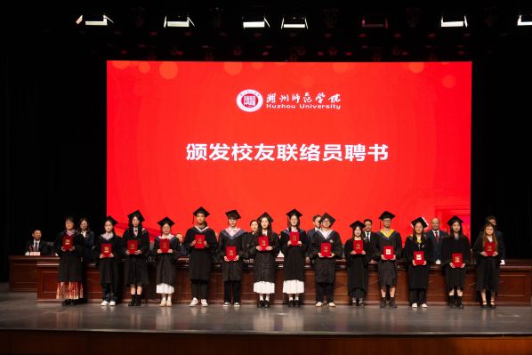 许慧霞为省优秀毕业生代表颁发荣誉证书。校领导班子成员为校友联络员颁发聘书。