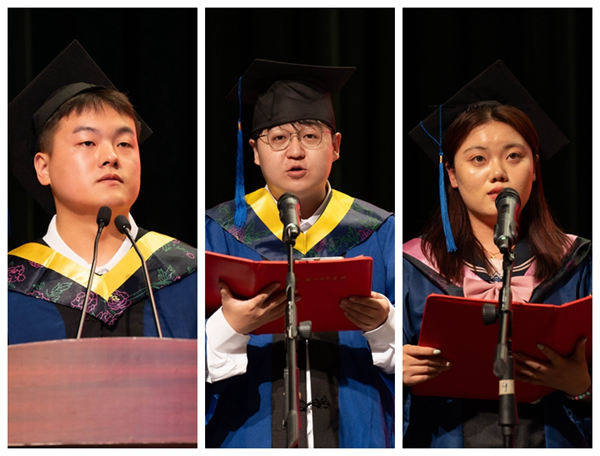 全国大学生外语能力大赛国赛金奖获得者、考取南京大学硕士研究生的外国语学院毛舒怡同学,国家奖学金获得者、优秀学生创业者、考取我校硕士研究生的经济管理学院宋滋同学,国家奖学金获得者、考取上海交通大学硕士研究生的医学院(护理学院)张瑜同学分别作为本科毕业生代表发言。他们深情表达了对母校和师长的感恩之情,并表示将永远铭记恩师的谆谆教诲和“明体达用”的校训精神,在未来的学习和工作中以追光者的姿态勇毅前行,以无畏的勇气追逐心中热爱。