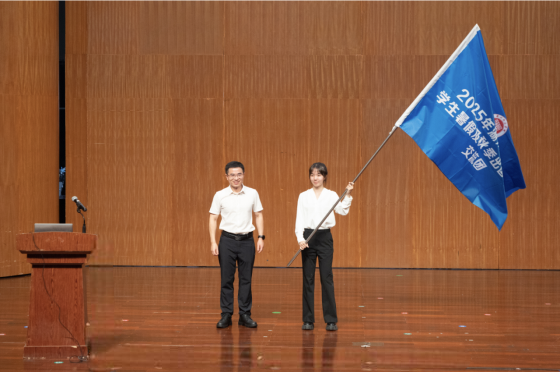 丁敢真为学生代表授予“2025年暑假及秋季出国(境)交流团”旗帜。
